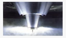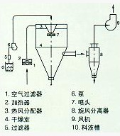 空氣經(jīng)過濾和加熱,進入干燥器頂部空氣分配器,熱空氣呈螺旋狀均勻地進入干燥室。料液經(jīng)塔體頂部的高速離心霧化器,(旋轉(zhuǎn))噴霧成極細微的霧狀液珠,與熱空氣并流接觸在極短的時間內(nèi)可干燥為成品。成品連續(xù)地由干燥塔底部和旋風分離器中輸出,廢氣由風機排空。