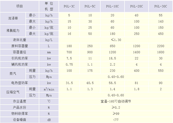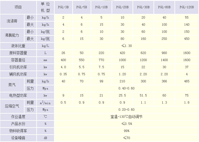 造型例:要求每批次處理流浸膏量I=120kg(含固量為30%)、種子量II=60kg,可由I、II得出理論成品量M=mI+mII=120kg*30%+60kg=96kg,工作時間T=120kg/30kg/h=4h,技術參數(shù)欄中可查出沸騰量為標準載荷范圍,故以每班完成兩個批次,選用PGL-30B型較為適宜。