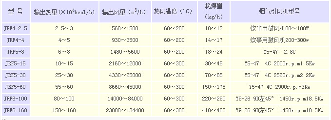 表中熱風溫度是按輸出風量確定的。熱風爐JRF4型的熱風溫度較高可達200℃以上, JRF5、JRF6熱風溫度較高可達300℃以上(特殊制造可達500℃以上),用戶根據需要進行調整。